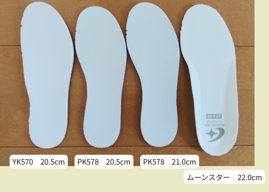 中敷きを比較すると、同じ20.5cmでも新モデルは少し短く見えます。(比較用のムーンスターは側面に立ち上がりがあるため、かかとを合わせました)また、土踏まず部分のソールが細くなっていることが分かりました。